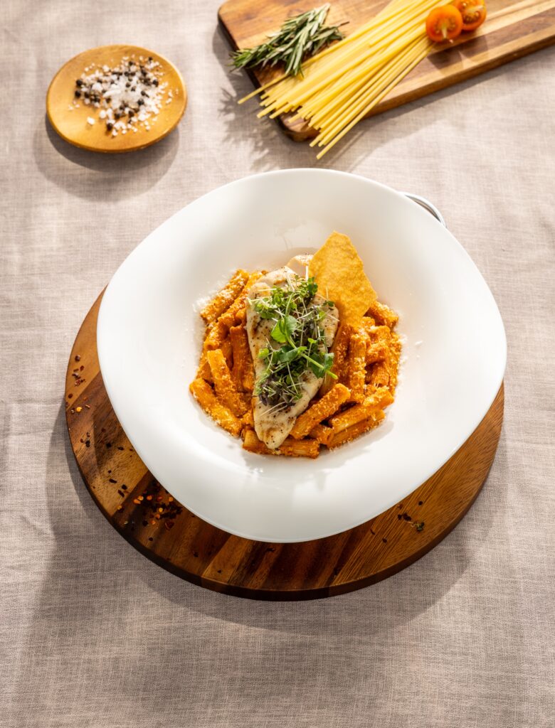 chicken Rigatoni Pasta 65 SAR ريجاتوني دجاج باستا Rigatoni pasta served with grilled chicken breast and creamy pink sauce, ريجاتوني باستا تُقدَّم مع صدور دجاج مشوي وصوص بينك كريمي (661 kcal)