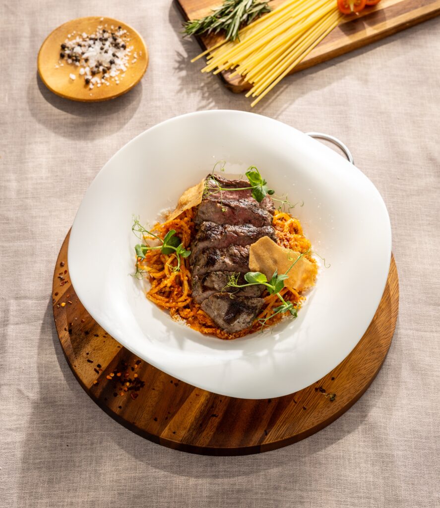 Spaghetti Steak 79 SAR Spaghetti with tomato sauce served with grilled Angus tenderloin slices اسباجيتي بصوص الطماطم تُقدَّم مع شرائح تندرلوين أنجوس مشوية (637 kcal)
