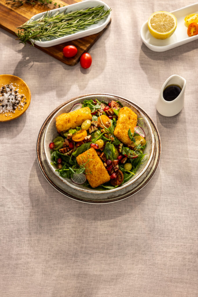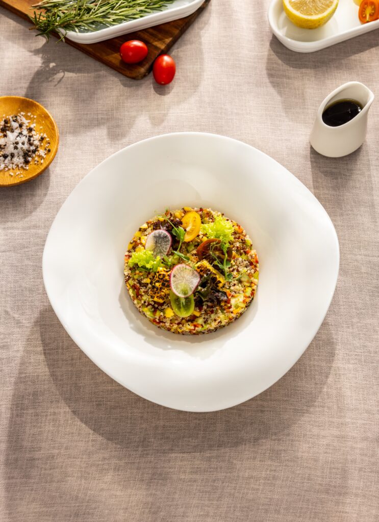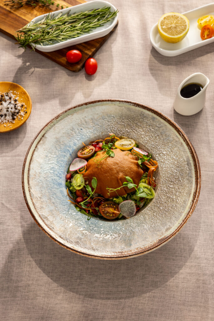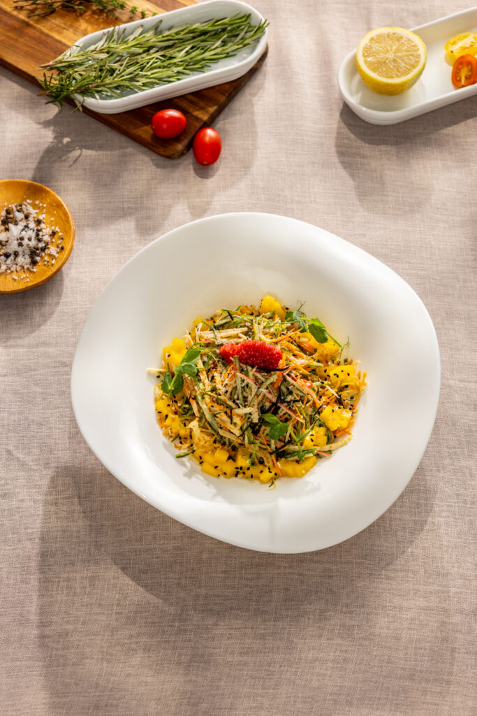 kani Salad 87 SAR سلطة الكاني Refreshing Japanese-style salad with crab sticks, mango, and cucumber, topped with caviar, black seeds, and crispy panko, dressed with creamy kani sauce. سلطة يابانية منعشة من شرائح الكراب والمانجو والخيار، تُقدَّم مع صوص كاني الكريمي، وتُزيَّن بالكافيار و الحبة السوداء والبانكو المقرمش (618 kcal)